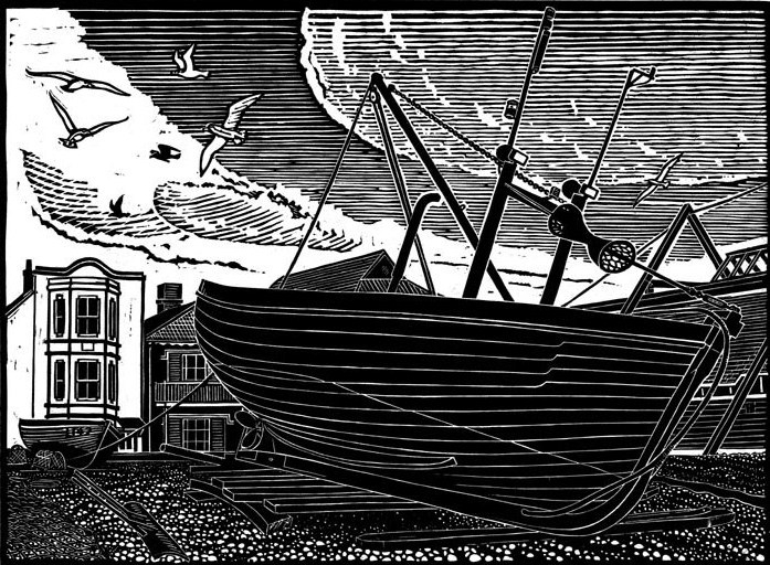 Longshore Drift was the perfect vehicle for Dodds to complete the circle and revisit the Aldeburgh of his Peter Grimes, first published twenty years before. The collaboration with the poet and historian Katrina Porteous, who lives on the Northumberland coast, came about because a friend had encouraged him to send Porteous a copy of The Song of the Waterlily, knowing that they would have much in common. She had edited an illustrated history of Northumbrian fishermen and had published poems about their fishing tradition. When she visited Aldeburgh, as writer in residence to its Poetry Festival in 2002, she was moved by the plight of the inshore fishermen of the east coast. “As I crunched along the Suffolk beaches, I thought of the decline of the longshoremen’s way of life, handed down for generations, and now vanishing before our eyes. Longshore Drift is an attempt to capture a glimpse of what we are losing.”